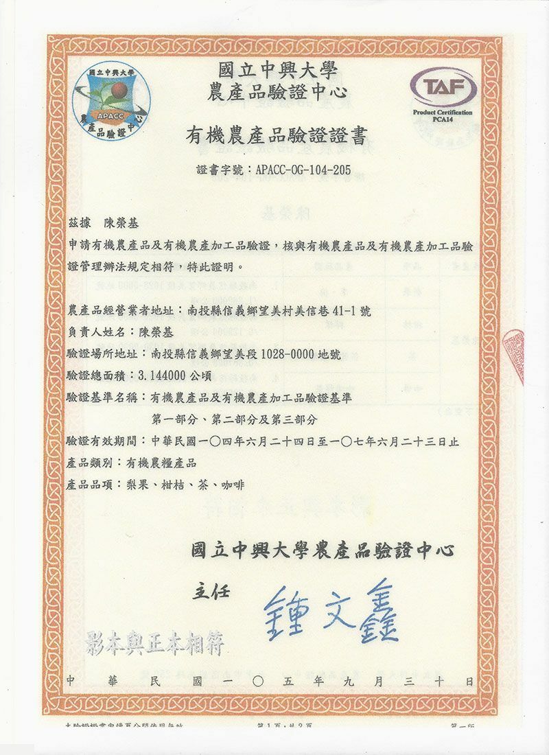 The organic tea garden is located in Xinyi Township, Nantou, about 1,300 meters above sea level. It is surrounded by the Yushan Mountains. The tea garden is surrounded by virgin forests. In this clean and pollution-free tea garden, pure, sweet and thick tea is produced.