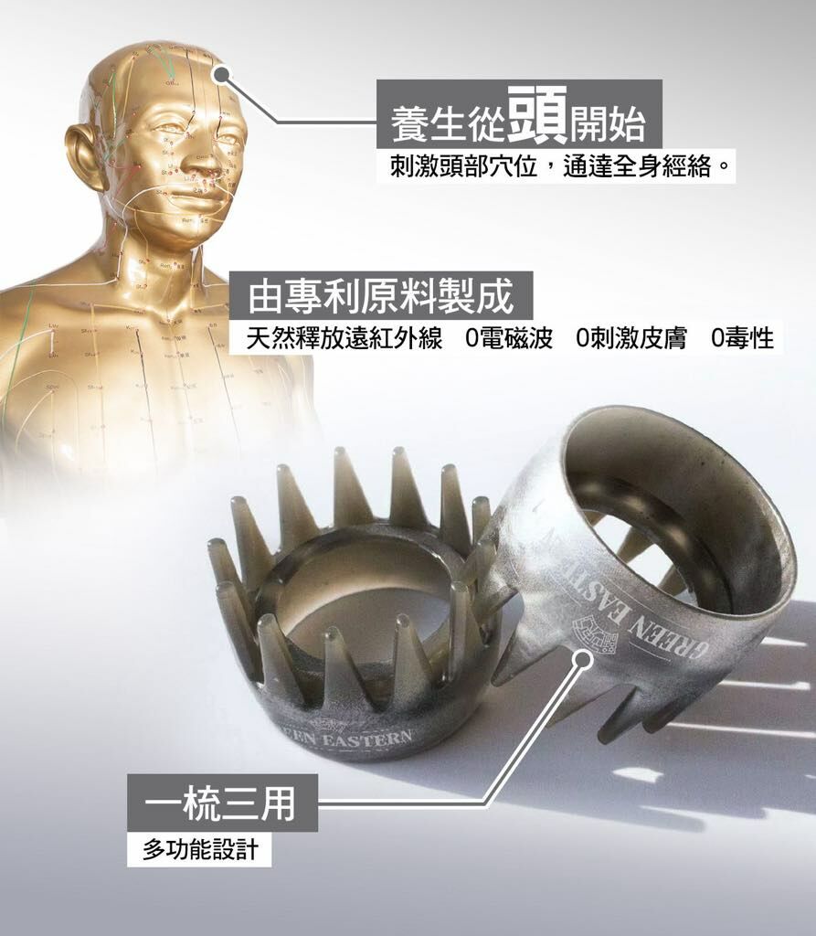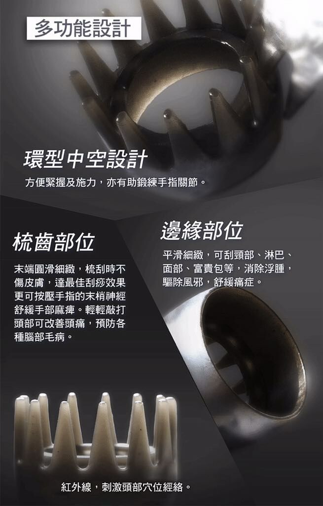 韓國專利設計的刮痧梳,加入天然礦物粉,具有極高的遠紅外線放射功能,13個梳齒按壓頭皮、臉部和身體穴位,達到防止脫髮,止痛、排毒和減肥作用。